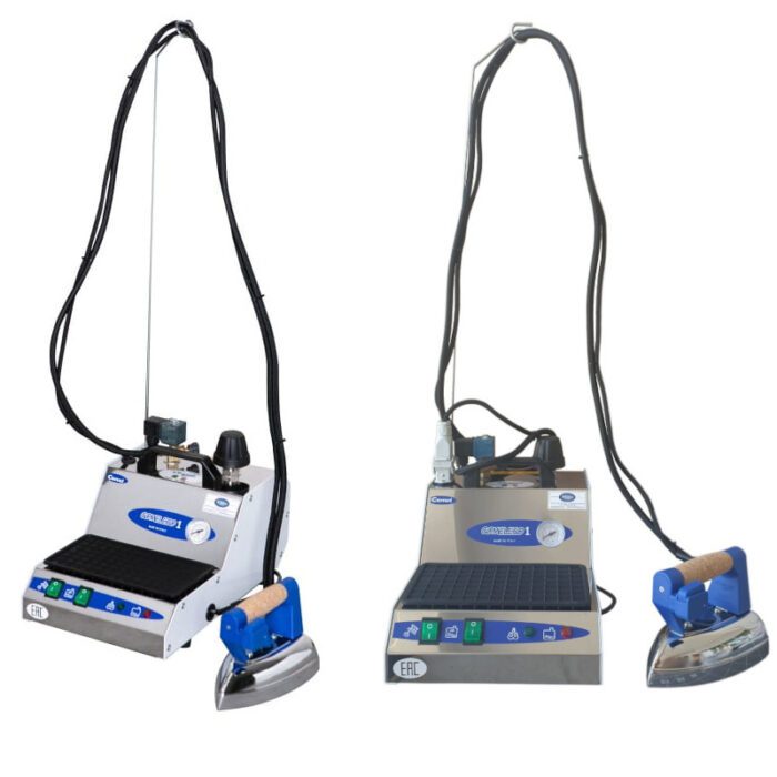 Comel Comeleco steam generator with 1.5 lt. boiler, complete of professional iron and silicone iron mat, cable stand, pressure gauge and solenoid valve with steam regulation. The outer frame varnished.