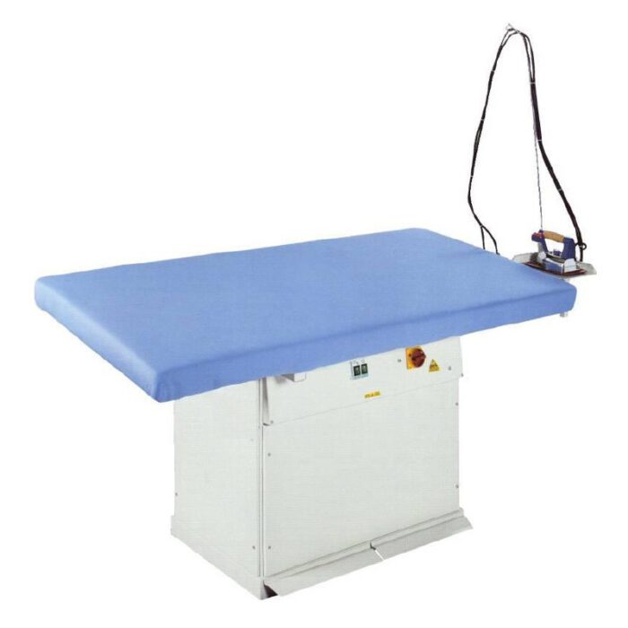 Professional rectangular ironing table 180×90 cm, with steaming and vacuum top and steam iron. Especially suited to press knitwear, the table is boilerless and designed to be connected to a main steaming system. The set includes: silicone iron pad, wire holder.