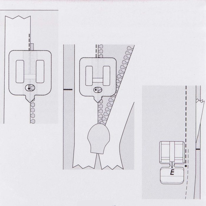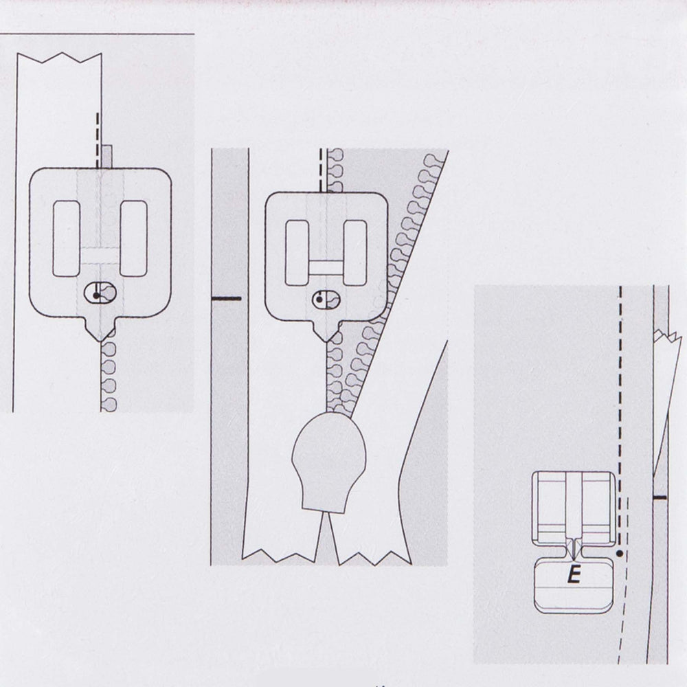 Snap on the regular Zipper Foot E to the left of the needle and adjust needle position as needed.