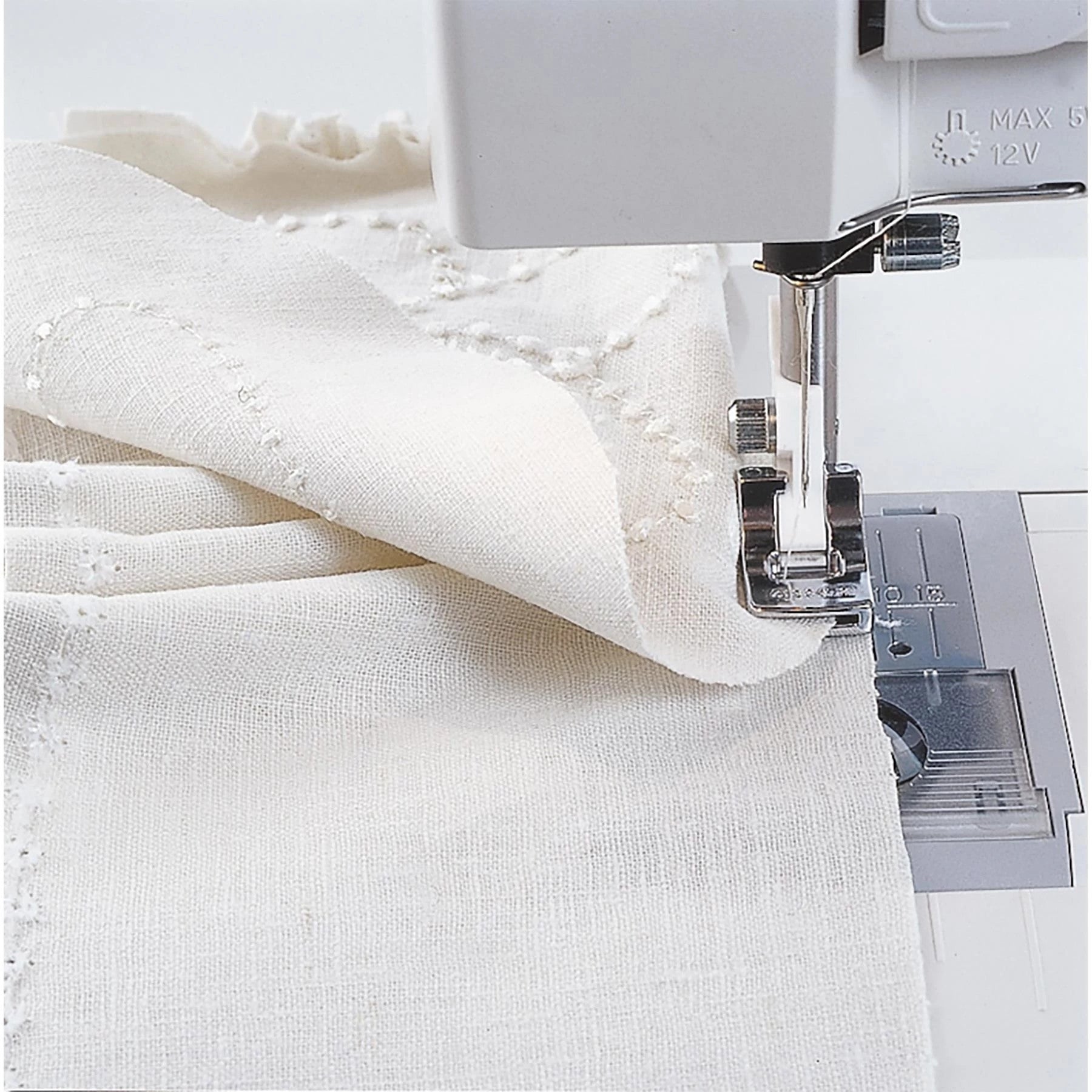 Designed for use with a straight stitch in the left needle position, this foot produces gathers by adjusting the stitch length and upper tension. The longer the stitch length and the higher the tension, the more gathers are formed. It allows for consistent results and can even gather and stitch the ruffle onto a flat piece of fabric simultaneously, saving time and enhancing precision.