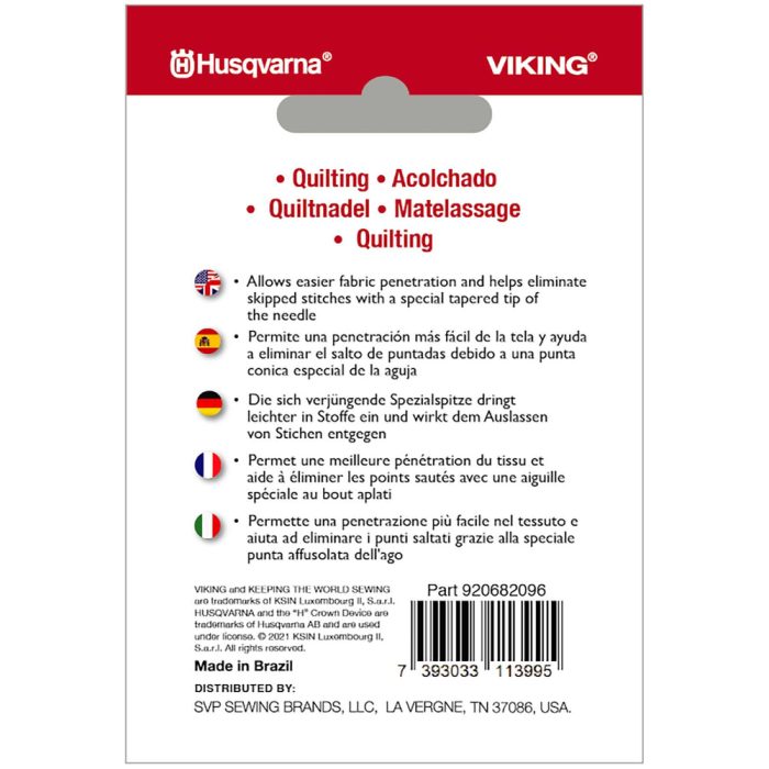 Achieve consistent, high-quality stitches when quilting with the HUSQVARNA® VIKING® Quilting Needles Size 90/14. Specifically designed for quilting and working with medium weight fabrics, these needles feature a special tapered tip that allows for easier fabric penetration and helps eliminate skipped stitches — even when sewing through multiple layers.
