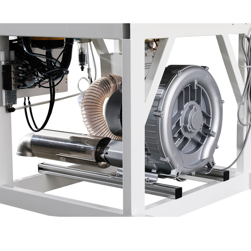 All parameters and patterns are programmed via a touchscreen panel. Patterns can be saved in the machine memory (up to 999 patterns) or on an external USB drive. An RFID reader allows automatic pattern loading depending on the type of sewing operation. The machine requires connection to a compressed air system and works with custom trays/cassettes for proper material handling.