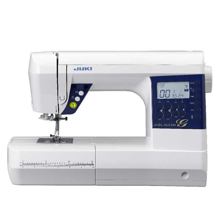 The JUKI HZL-G220 is a full-sized computer-controlled sewing machine with a bright LCD screen. Take on big projects with the wide underarm space and create beautiful seams with the box feeding system.