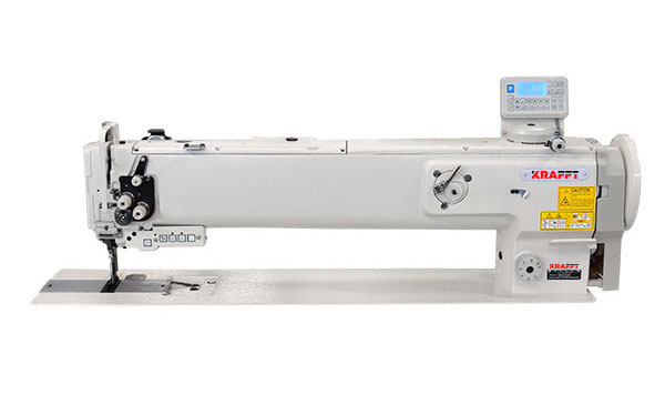 KrafftAutomatic long-arm lockstitch machine, 1-needle with triple feed (needle, serration and presser foot) for sewing heavy materials such as leather, furniture and car upholstery. Adjusting the rise of the walking foot with a scaled disc on the machine head.