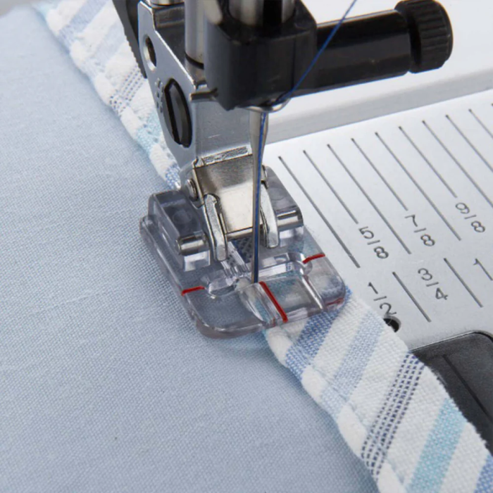 Sew using a straight stitch at length 2.5. The groove guides the piping perfectly as you sew.