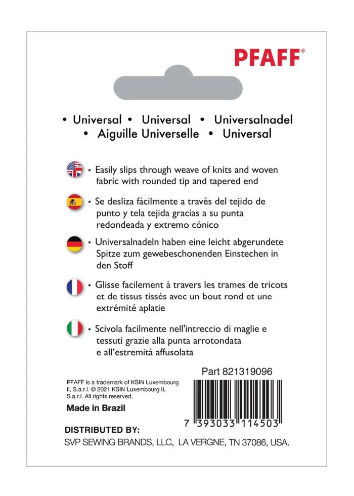 These PFAFF® Universal Needles are specially designed for all-purpose use, easily slipping through the weave of lightweight knit and woven fabrics. Featuring a rounded tip and tapered end, they ensure smooth stitching without damaging delicate materials. Ideal for everyday sewing projects involving various light fabrics, these needles provide reliable performance.