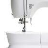 This machine makes buttonholes simple with six different one-step buttonhole styles, including basic, rounded end, and keyhole designs suitable for various projects like clothing and home décor. The removable cover reveals a free arm, ideal for sewing tubular items such as sleeves and hems. For larger projects, the included extension table provides extra workspace. With eight different presser feet included, you can take your sewing to the next level. The front-loading bobbin system, built-in needle threader, and adjustable stitch features ensure precision and ease in every project.
