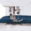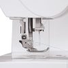 Other features include an automatic needle threader, top drop-in bobbin, adjustable speed control, and touch button tie-off and reverse. The heavy-duty metal frame and stainless steel bed plate provide stability and smooth fabric flow, while the extra high presser foot lifter and presser foot sensor make handling thick fabrics easy and safe.