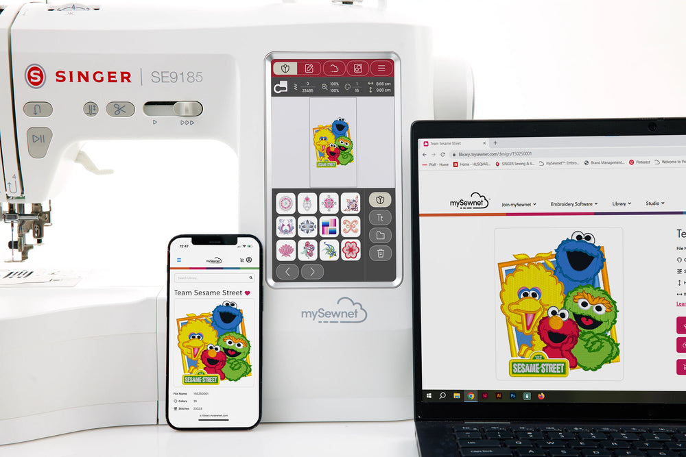 The mySewnet™ connectivity includes a 90-day free trial of the embroidery software and access to over 8,000 designs. All your mySewnet™-enabled devices can connect and sync wirelessly, making design sharing easy.