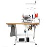 The machine is equipped with a dual differential feed system—bottom feed (feed dogs) and upper feed (walking foot)—to ensure consistent fabric movement, even over thick seams or multiple layers. It features pneumatic thread trimming, chain stitch suction, and a servo motor integrated into the machine head, offering quiet operation, reduced vibration, and up to 75% energy savings compared to traditional motors. Sweatband tape insertion is controlled via a knee lever, and a set of four adjustable tension rollers ensures uniform collar ribbing application across the neckline. An integrated LED light with adjustable brightness improves visibility in the work area.