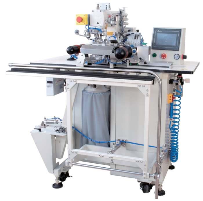 Equipped with a cylindrical Siruba C007KP head and user-friendly touch control panel, the machine supports automatic thread cutting, edge suction, and size-adjustable settings. It’s easy to operate and can be managed by a single operator for two machines simultaneously.